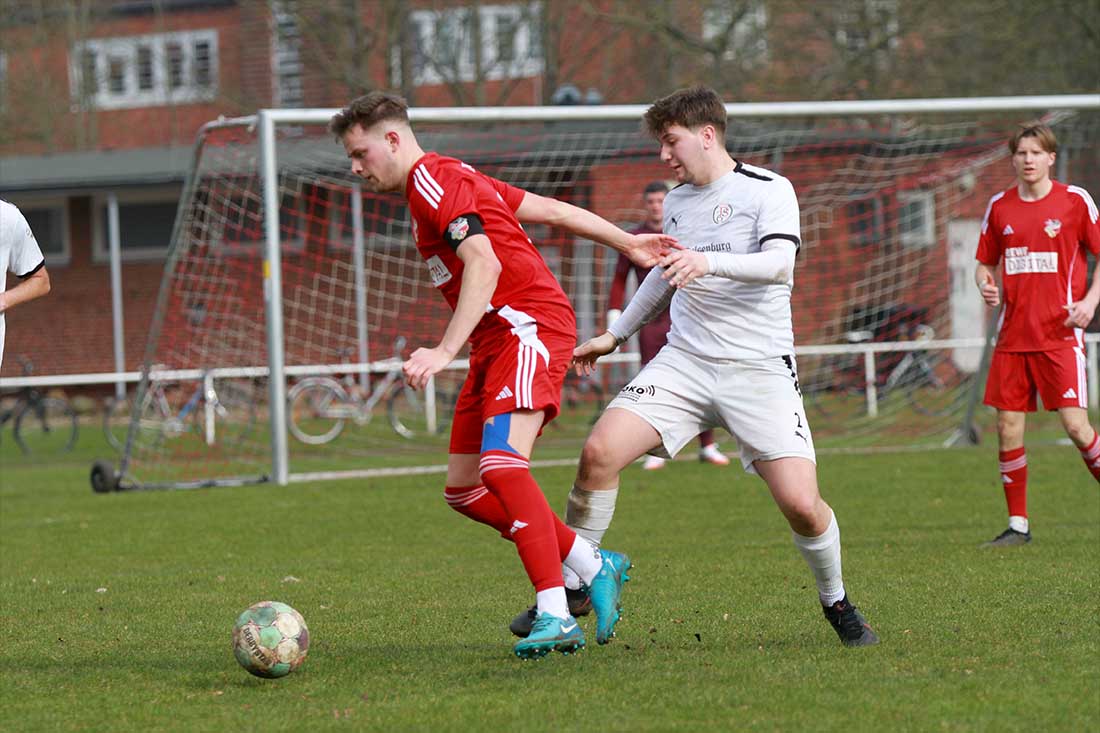 Der 1:2-Treffer von Louis Reinicke (li.) sollte der einzige für den Kieler MTV gegen Flintbek bleiben. © 2026 Ismail Yesilyurt
