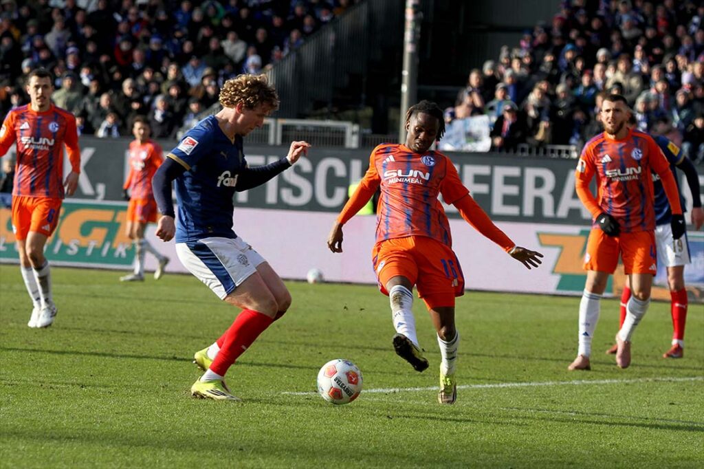 Trotz Schalker Überlegenheit bis zum 0:2 hat Holstein seine Chancen. Links wird John Tolkin, der insgesamt eine starke Partie macht und sich offensiv häufig einschaltet, frei gespielt. Sein Abschluss (8.) ist jedoch zu zentral, aus der aussichtsreichen Position springt zu wenig heraus. Auf der anderen Seite pariert Krumey gegen Dejan Ljubicic (10.). Nach dem 0:1 sind Adrian Kapralik und Andu Kelati dem Ausgleich in einer Szene sehr nahe (25.). Der Impuls kommt von Tolkin, der sich links stark in Szene setzt.