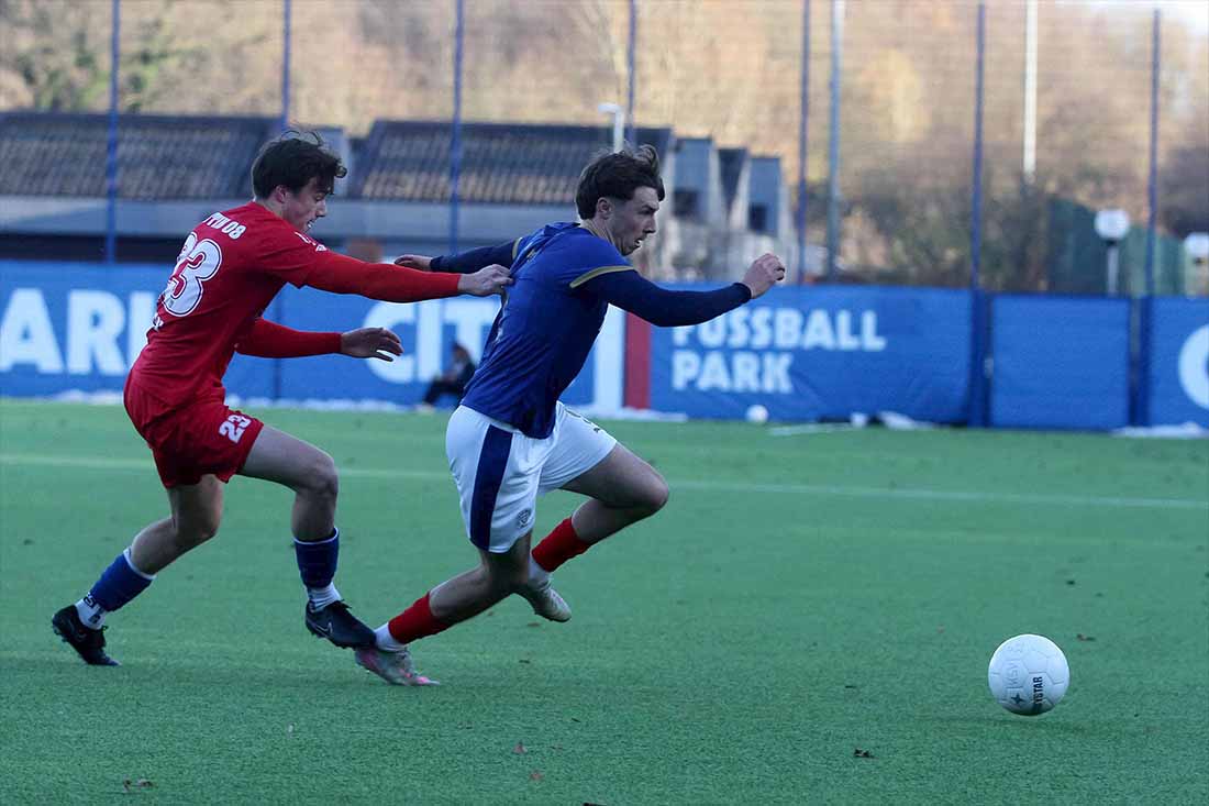 Louis Köster (Holstein Kiel II) im Spiel gegen Tom-Luca Weist (li., Eutin 08). © 2025 Ismail Yesilyurt