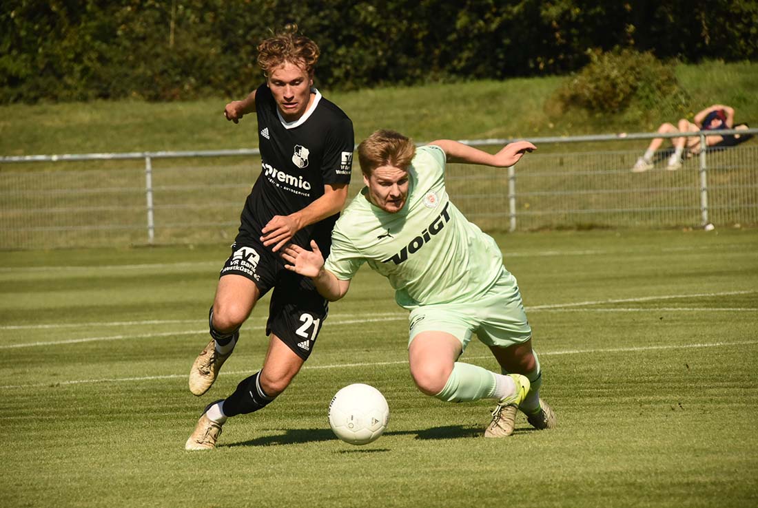 Thede Reimers (Heider SV) gegen Calvin Ehlert (re., PSV). © 2025 Olaf Wegerich