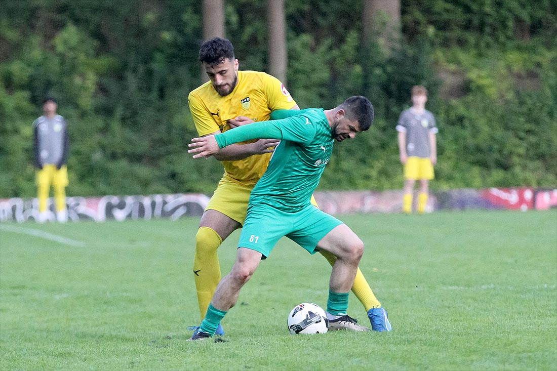 Driton Gashi (TSV Klausdorf), der hier den Ball gegen Kosovar Morina (SVE Comet) abschirmt,macht sein 13. und 14. Saisontor. © 2025 Ismail Yesilyurt