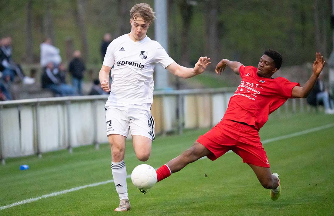 Defensivspieler Tarek von Böhlen, hier gegen Noah Odiase (re.), war der einzige war der einzige Heider Torschütze in Eutin. © 2026 Volker Schlichting