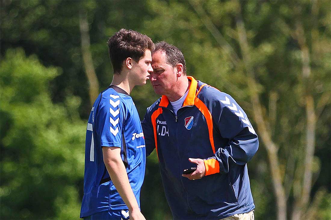 Heiko Dukats-Jadwizak im Gespräch mit einem Spieler der U 15 Spvg Eidertal Molfsee in der Regionalliga 2014/15 gegen den TSV Havelse. © 2015 Ismail Yesilyurt