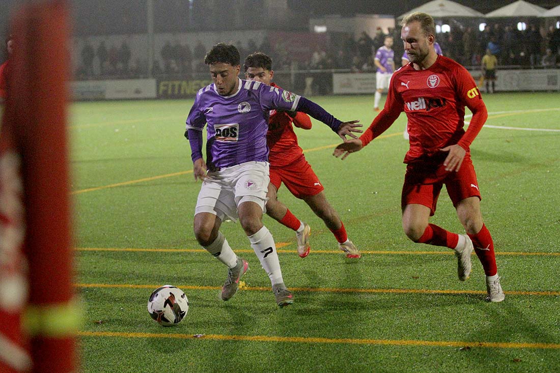 Doppeltorschütze Julius Alt (re.) und Devran Boztepe (Kilia Kiel) setzen Berk Akcicek (VfR Neumünster) unter Druck. © 2025 Ismail Yesilyurt