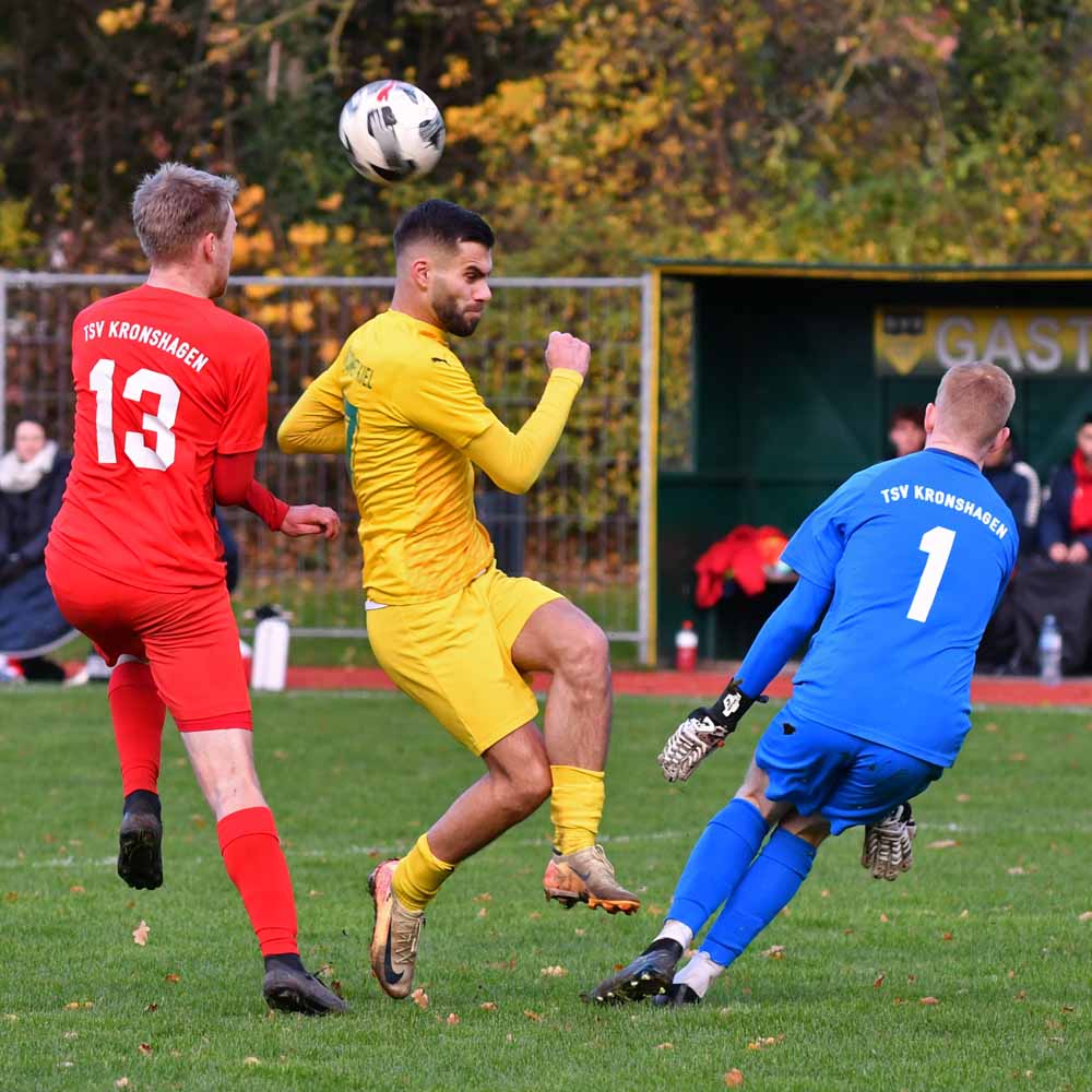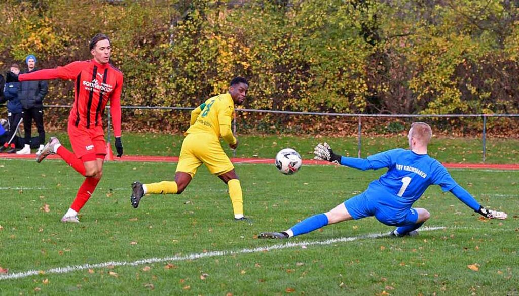 Nach dem kuriosen Seitenwechsel nutzten die Gäste ihre Chance. Schiedsrichter Niklas Augustat hatte nach der schweren Verletzung des Cometen Felix Gesper beide Teams schon nach 43 Minuten zum Halbzeittee gebeten. Wieder raus wurden zwei Minuten gespielt und danach sofort die Seiten getauscht. Beim 1:0 zog Badreddin Hamze nach einem langen Ball an Lukas Losch vorbei und traf ins leere Tor zum 1:0. Kronshagen schien nun die Kontrolle zu übernehmen, doch der Tabellenletzte reagierte schnell: Janneck Rassmann erzielte nach einer gut getretenen Ecke den Ausgleich.