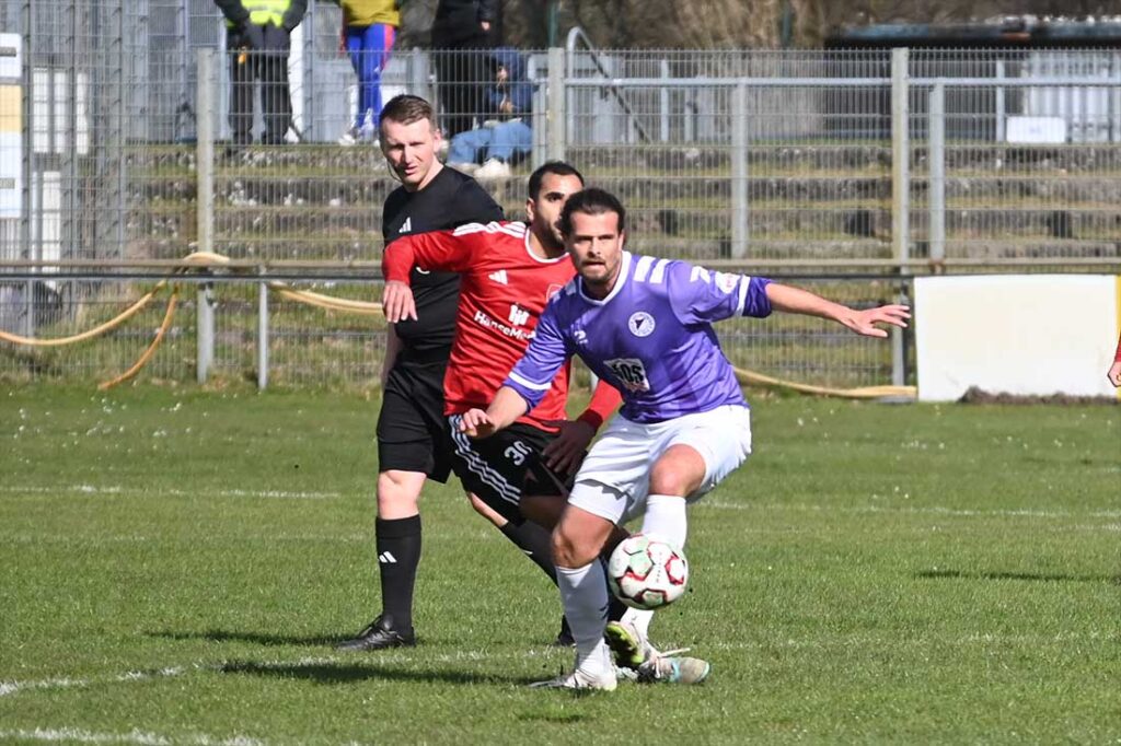 Den Hausherren fehlten beim Aufbauspiel oft die Anspielstationen im Mittelfeld, darum versuchte man es meist lang über die Flügel. Doch damit konnte man die Genz-Elf kaum mal in Verlegenheit bringen. Doch auch die VfR-Defensive stand sicher. So mußte auch bei KT ein langer Ball herhalten, um zur ersten Chance zu kommen. Der schnelle Max Spreitzer war an der Grundlinie an Newe schon vorbei, seine Hereingabe klärten Tom Schilling und Kenny Korup knapp vor Malte Pietsch.