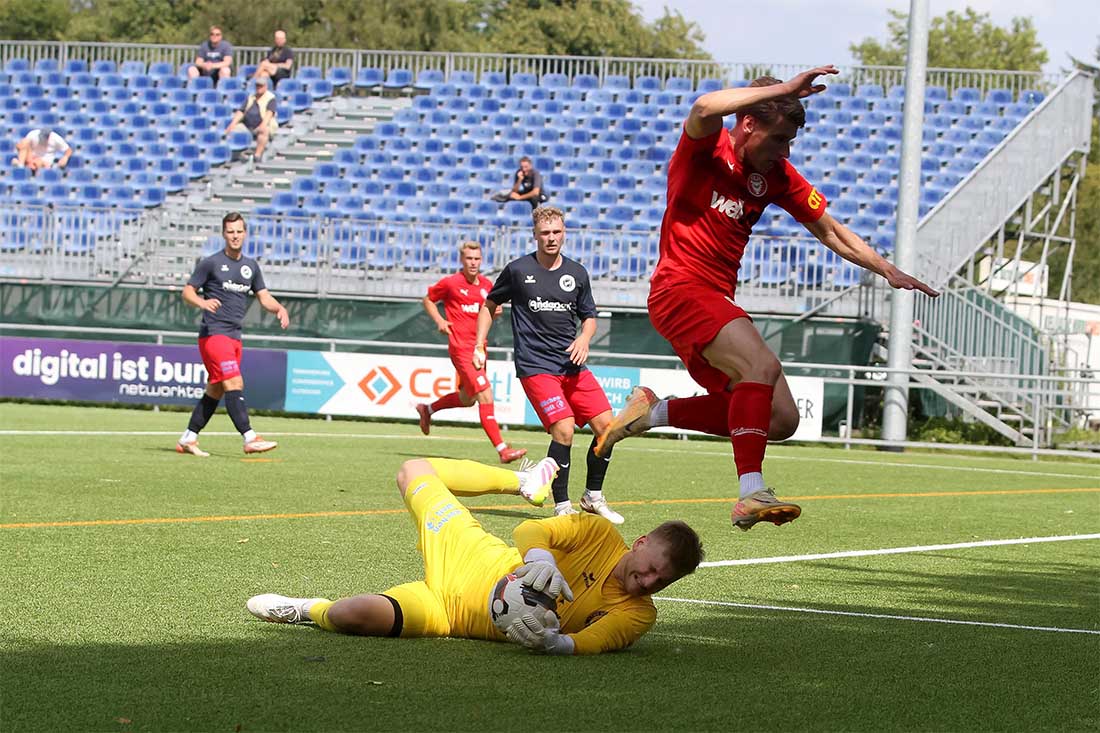 Kilia Kiel übersprang zum zweiten Mal die hohe Hürde Nordmark Satrup. Szene aus dem Hinspiel zwischen Torschütze Jannis Voß und Keeper Jonas Wolz (Nordmark Satrup). © 2025 Ismail Yesilyurt