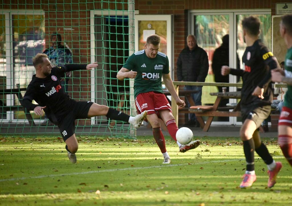 Viel hätte nicht gefehlt, und den Gastgebern wäre wenig später durch René Helmcke nach flacher Hereingabe von Killian Pingel von der linken Seite der durchaus verdiente 3:3-Ausgleich gelungen, doch der Schuss des ehemaligen Spielers vom VfR Horst aus gut zwei Metern krachte an die Unterkante der Torlatte.