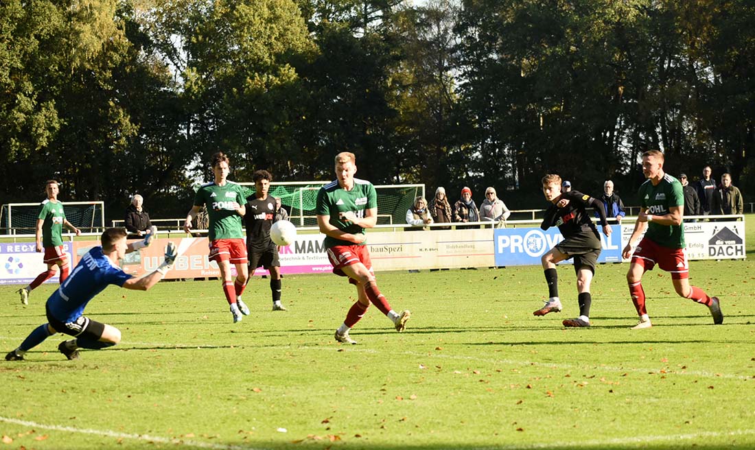 Viel hätte nicht gefehlt, und den Gastgebern wäre wenig später durch René Helmcke nach flacher Hereingabe von Killian Pingel von der linken Seite der durchaus verdiente 3:3-Ausgleich gelungen, doch der Schuss des ehemaligen Spielers vom VfR Horst aus gut zwei Metern krachte an die Unterkante der Torlatte.