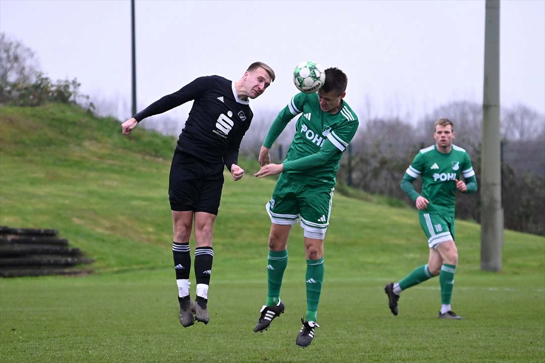 Kopfballduell zwischen Arne Burmeister (Hademarschen) und Bjarne Hansen (Todenbüttel). © 2025 Olaf Wegerich