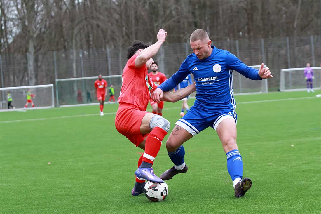 Silas Bünning (Oldenburger SV), hier gegen Melih Cerrah (li., Inter Türkspor Kiel) gelang das wichtige 1:1. © 2026 Ismail Yesilyurt