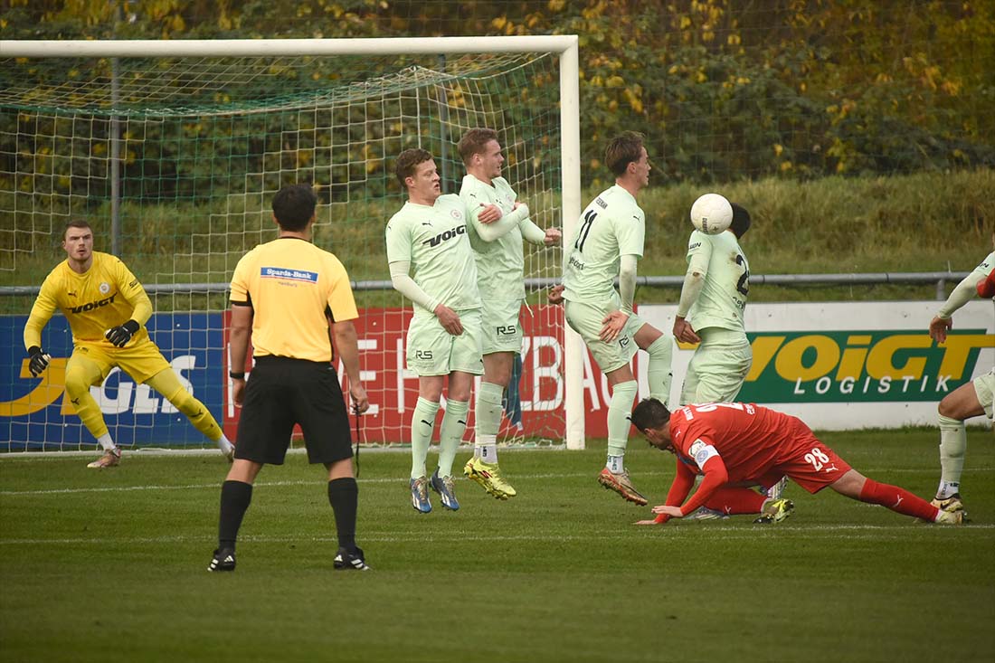 Sinnbildlich für Holsteins fehlende Durchschlagskraft – ein Freistoß bleibt in der Mauer hängen. © 2025 Olaf Wegerich
