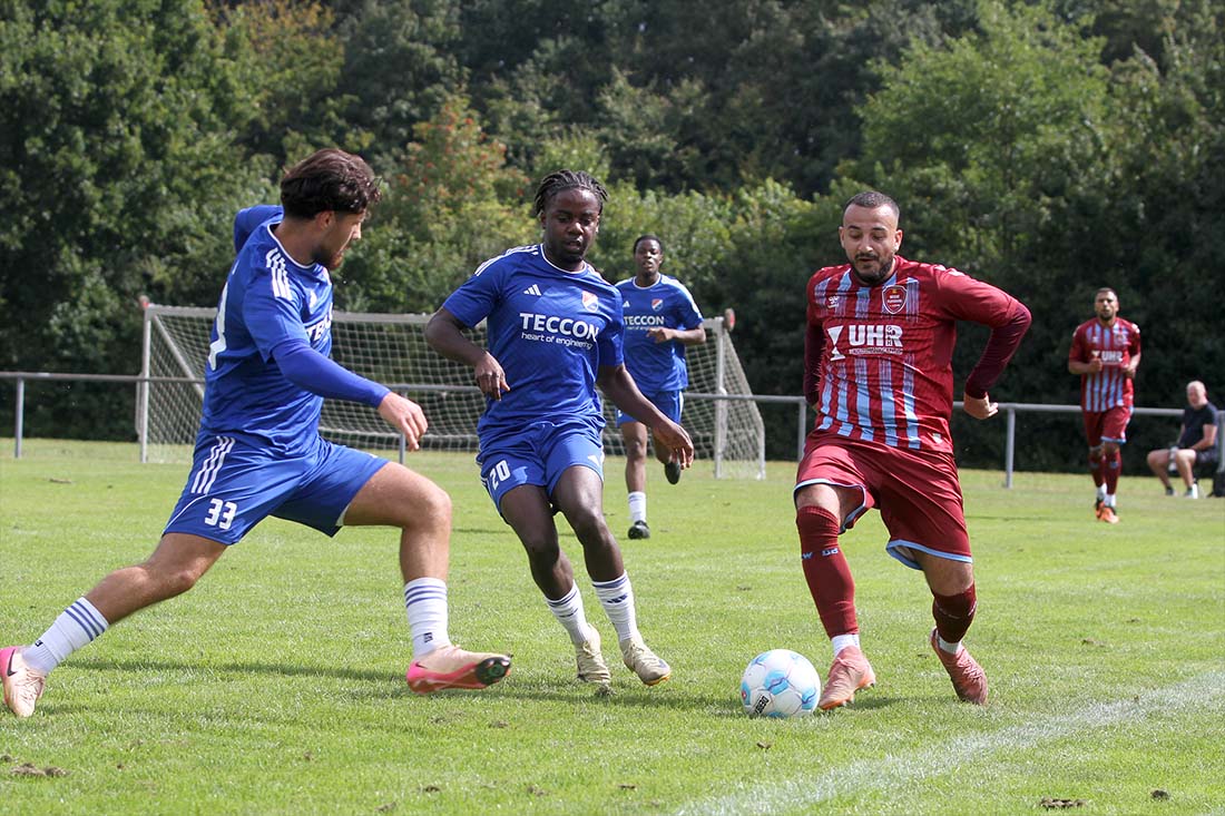 Glückwunsch Elvind Bajrami (SC Weiche Flensburg 08 II), hier gegen Salih Ramo (li.) und Joel Prempeh (Eidertal), zum 25. Geburtstag. © 2025 Ismail Yesilyurt