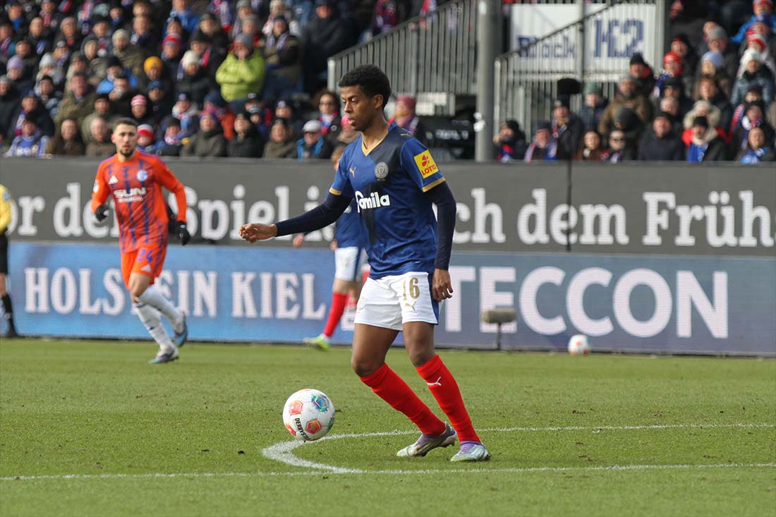 Andu Kelati (Holstein Kiel) sorgte für einige Farbtupfer in der Offensive, zu mehr reichte es gegen kampfstarke Karlsruher nicht. © 2026 Ismail Yesilyurt