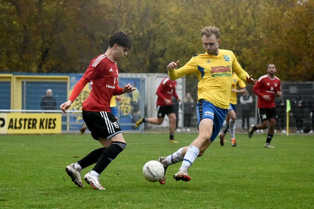 Dass die Gäste von der Kaltenkirchener TS eine echte Bereicherung für die Oberliga sind, bewies die Mannschaft von Trainer Martin Genz durch ihr mutiges Spiel in der Anfangsphase, als sie die sichtlich überraschten Gastgeber in deren Hälfte einschnürte und sich zahlreiche gute Einschussmöglichkeiten erspielte. Es hätte sich wohl keiner beschweren dürfen, wenn der deutlich zielstrebiger agierende Aufsteiger seine Chancen durch Finn Luca Rerop, der zweimal zum Abschluss kam und dabei einmal an Owusu scheiterte und beim zweiten Versuch das Gehäuse der Gastgeber nur knapp verfehlte, genutzt hätte, um in Führung zu gehen. Hinzu kamen noch gute Gelegenheiten durch Max Spreitzer, der aus spitzem Winkel an Ozuzu scheiterte, sowie durch Josef Jueidi, die ebenfalls ungenutzt blieben.