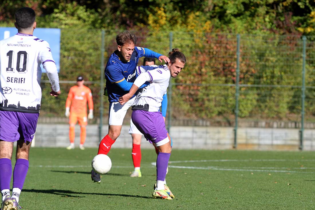 Cengizhan Koc (Holstein Kiel II), hier gegen Kevin Schulz (re., VfR Neumünster) initiierte mit einem Flatterball den 3:1-Erfolg. © 2025 Ismail Yesilyurt