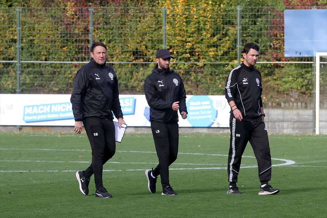 Dieses Trainer-Trio gibt es nicht mehr bei Holstein Kiel II – Willi Weiße (re.) mit den zukünftigen Interims-Trainer Linus Schewior (mitte.) und Sven Boy. © 2025 Ismail Yesilyurt