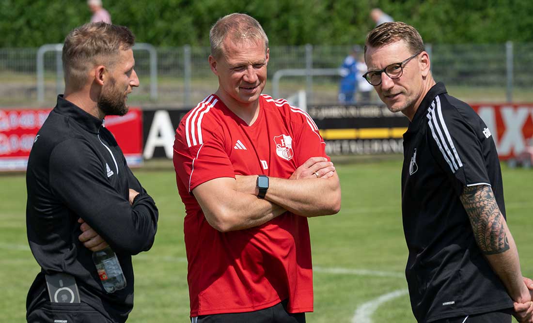 Lockere Plauderrunde zwischen den Trainern Florian Stahl (Oldenburger SV) sowie Markus Wichmann (re.,Heider SV) und seinem Co-Trainer Tobias Dau (mitte). © 2025 Volker Schlichting